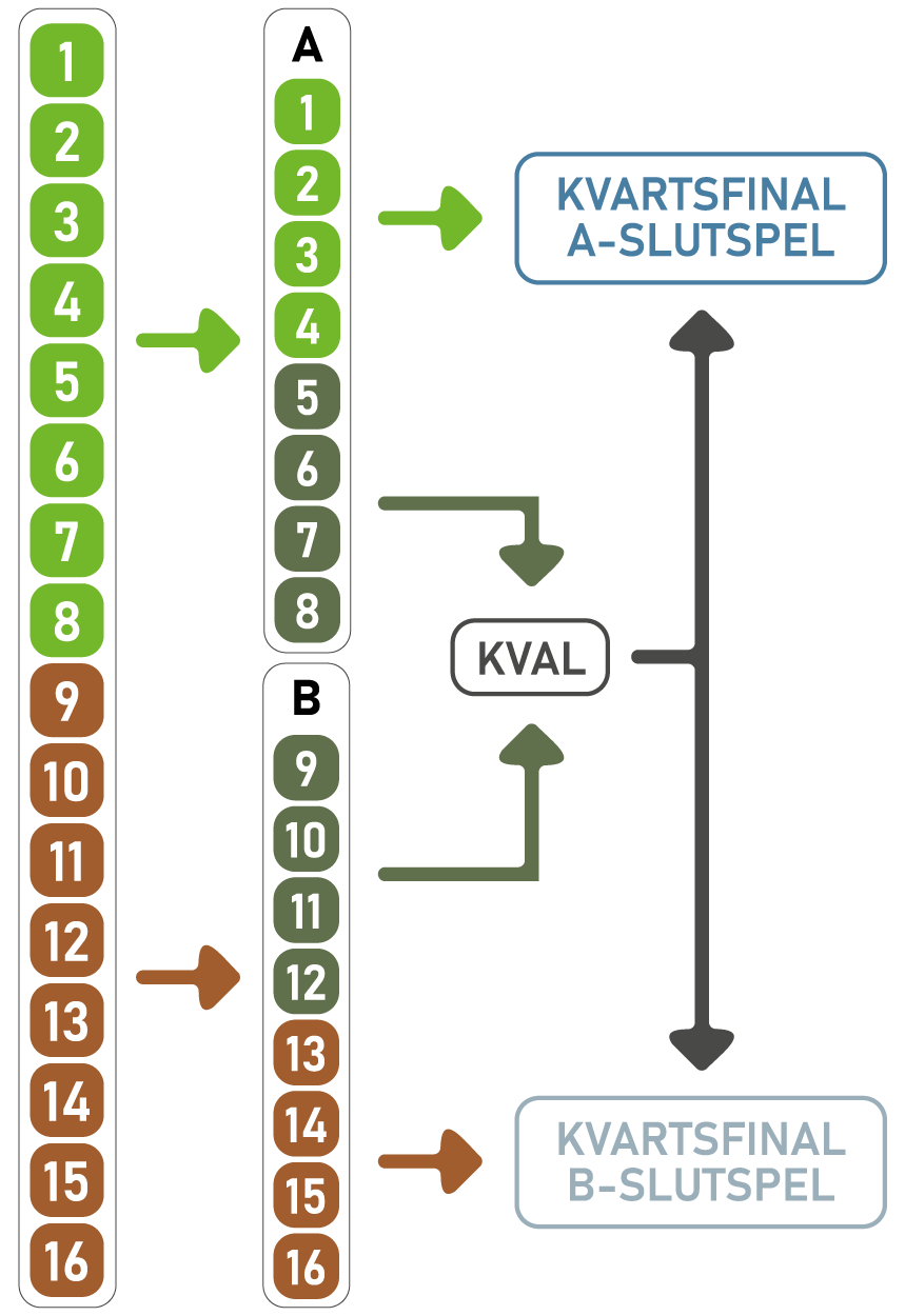 När samtliga 22 omgångarna är spelade avancerar lagen till slutspel. Från A-gruppen går lag 1-4 direkt till kvartsfinal. Lag 5-8 spelar en kvalmatch mot de 4 bäst placerade lagen i B-gruppen. Vinnarna går till kvartsfinal medan förlorarna hamnar i B-slutspelet. Där väntar de 4 sämst placerade lagen i B-gruppen som alltså får avsluta säsongen med att spela B-slutspelet.